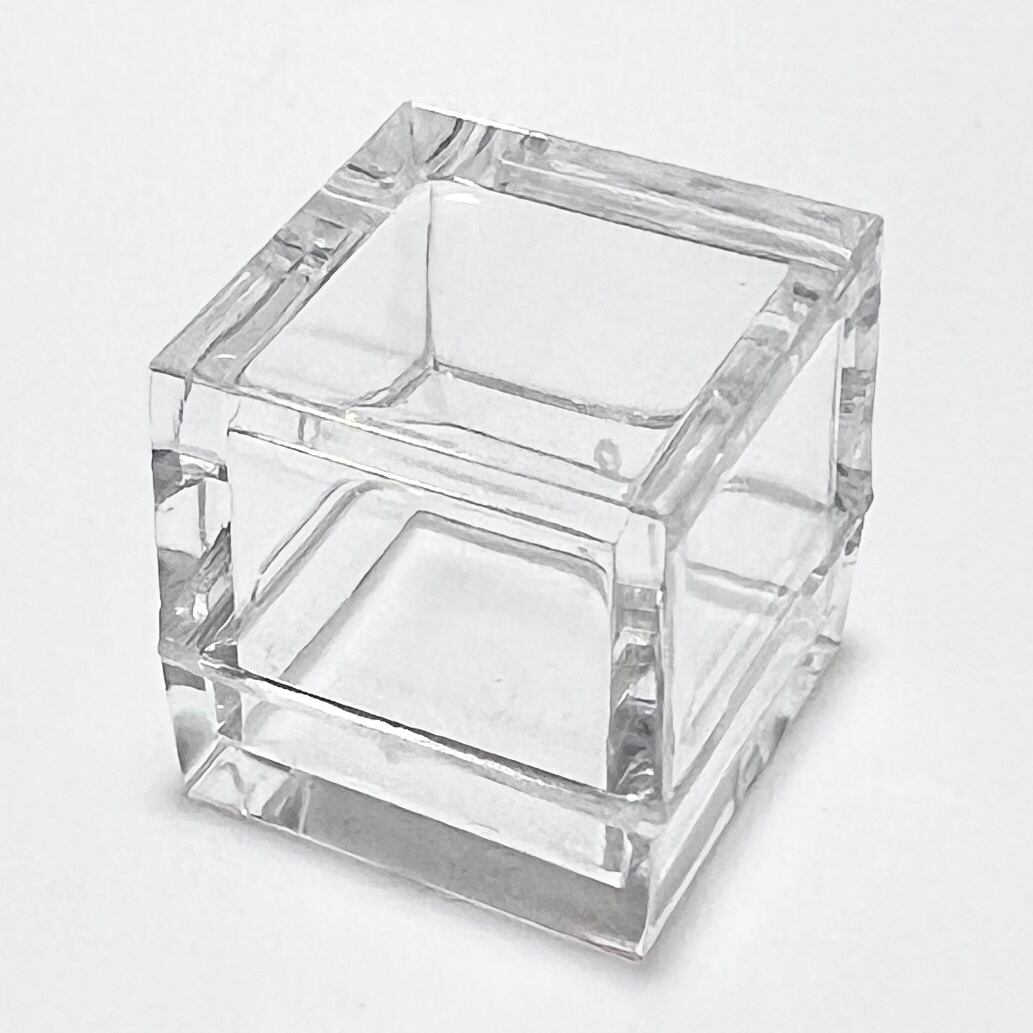 アクリル製の、1個用ケースです。キューブがぴったり入り、セパレート式の底がカチッとはまるタイプになります。透明なので上面にレーザー刻印面を向ければそのまま鑑賞できます。